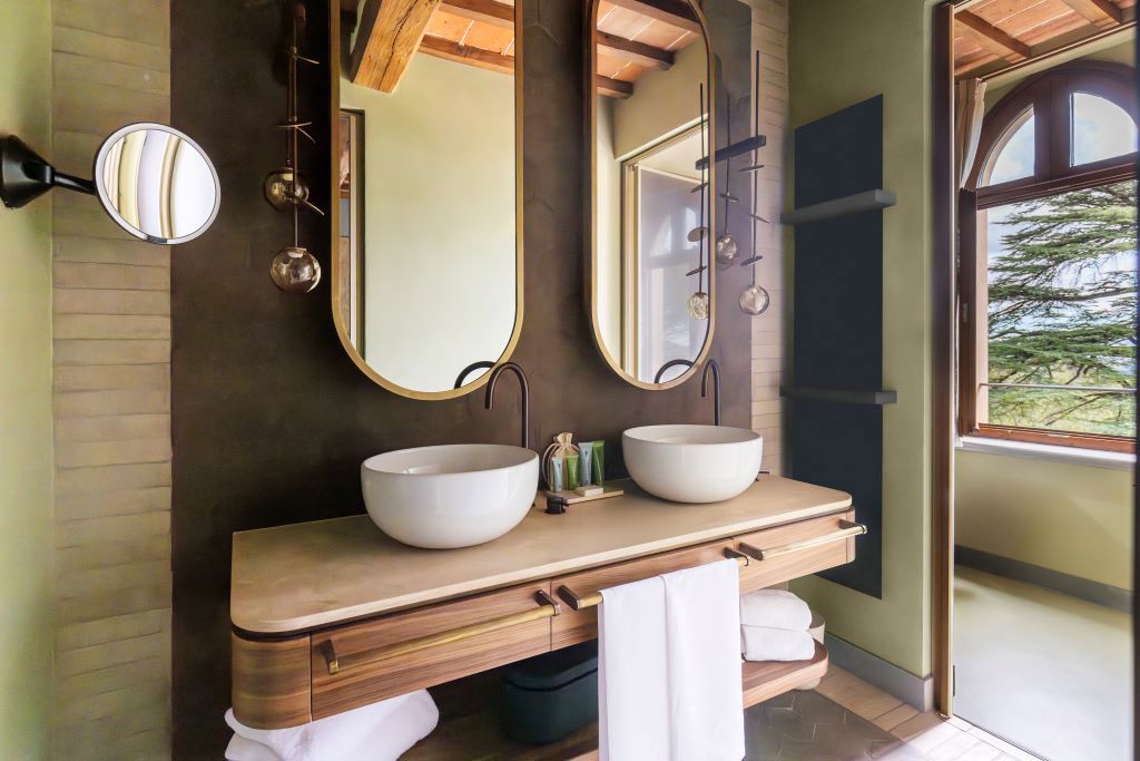 Within these luxury confines, guests are enveloped in a palette of soft or bold hues reminiscent of the Renaissance era, seamlessly blending refined contemporary design elements with details inspired by Umbrian cultural heritage—a testament to the meticulous conservation efforts spearheaded by Spagnulo & Partners.